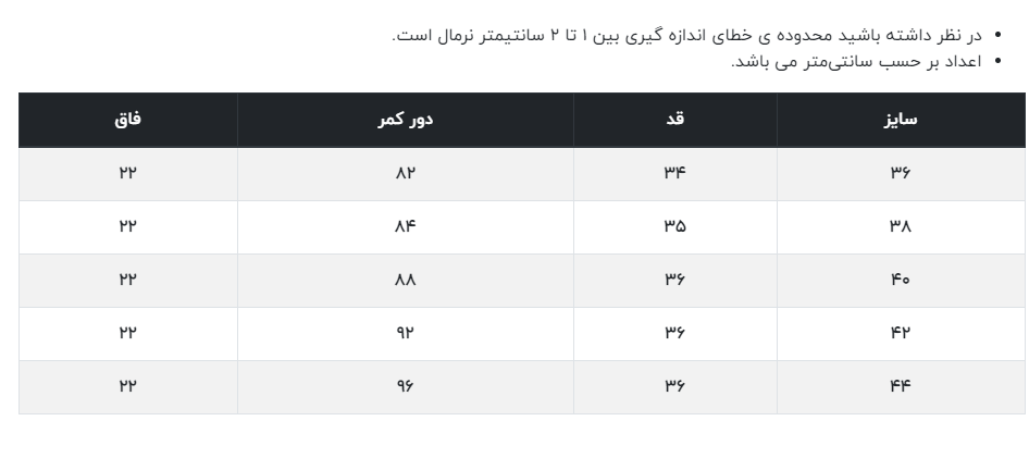 - قد لباس: مناسب سایز ۳۶، در حدود ۳۴ سانتی متر