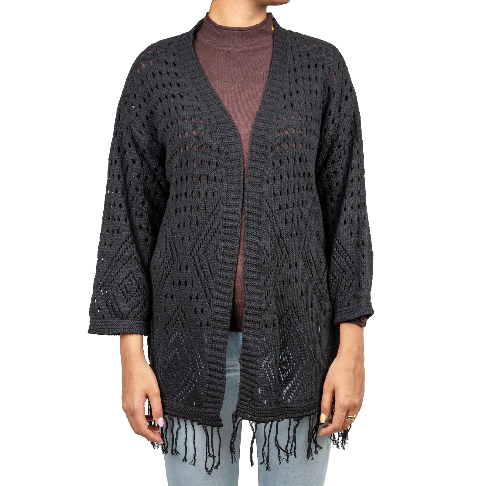 - این ژاکت با طراحی بافتنی و لبههای ریشدار، حس راحتی و جذابیت را بهطور همزمان ارائه میدهد.