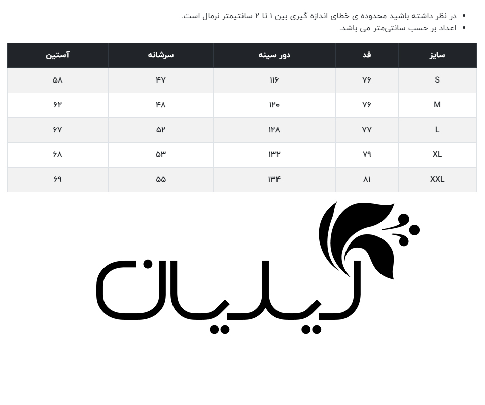 - برای راهنمای سایز به عکس آخر مراجعه نمایید.