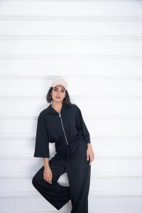- یکی از شاخصترین ویژگیهای بلوز زنانه برنس ، یقه چیندار آن است که جلوهای زنانه و خاص به بالاتنه میبخشد و بهویژه در استایلهای کلاسیک بسیار کاربردی است. آستینها به صورت رگلان طراحی شدهاند و در قسمت مچ با کشدوزی ظریف، علاوه بر حفظ فرم آستین، زیبایی بصری بالاتنه را نیز تقویت میکنند.