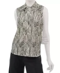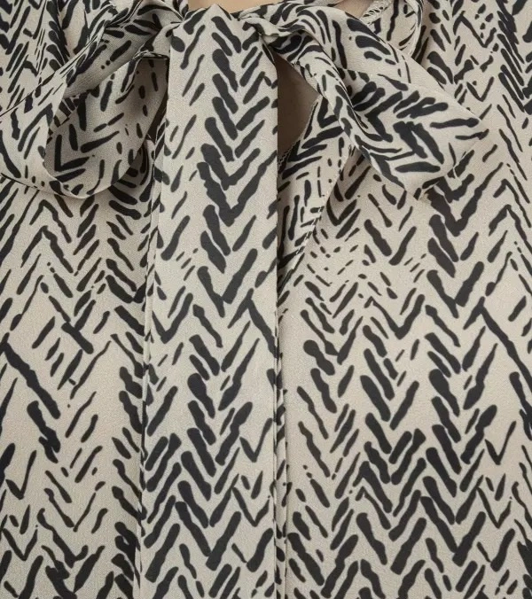 • طراحی خاص یقه کراواتی به‌همراه پارچه خال‌خالی و فرم متناسب (Fit)، این تاپ را به آیتمی خاص در کمد لباس بانوان خوش‌پوش تبدیل کرده است.