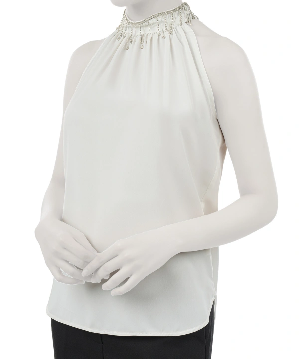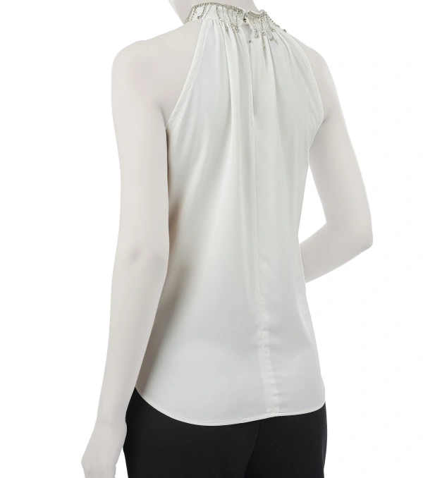 - این تاپ با طراحی یقه ایستاده چیندار با تزئینات براق، جلوهای زنانه و جذاب به استایل شما میبخشد.