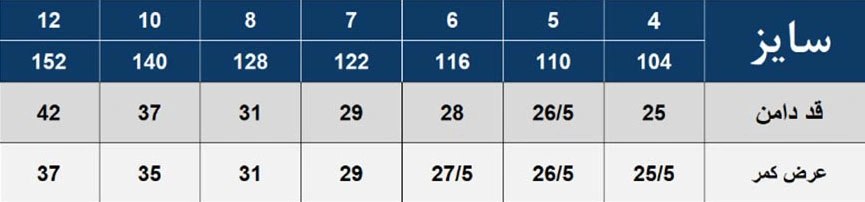 سایز 4 سال, 5 سال, 6 سال, 7 سال, 8 سال, 10 سال, 12 سال