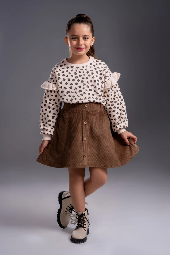 • دامن دخترانه ملورینا Melorina کد 42130 با طراحی نیم‌کلوش و پارچه کبریتی قهوه‌ای، یکی از بهترین گزینه‌ها برای استایل پاییزی و زمستانی دخترانه است.