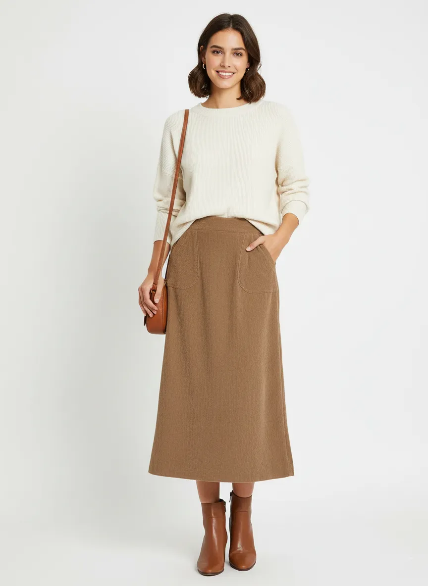 - این دامن با قد میدی و تنخور خوشفرم، استایلی مرتب و زنانه ایجاد میکند و بهراحتی با انواع بوت، نیمبوت و لباسهای گرم ست میشود.
