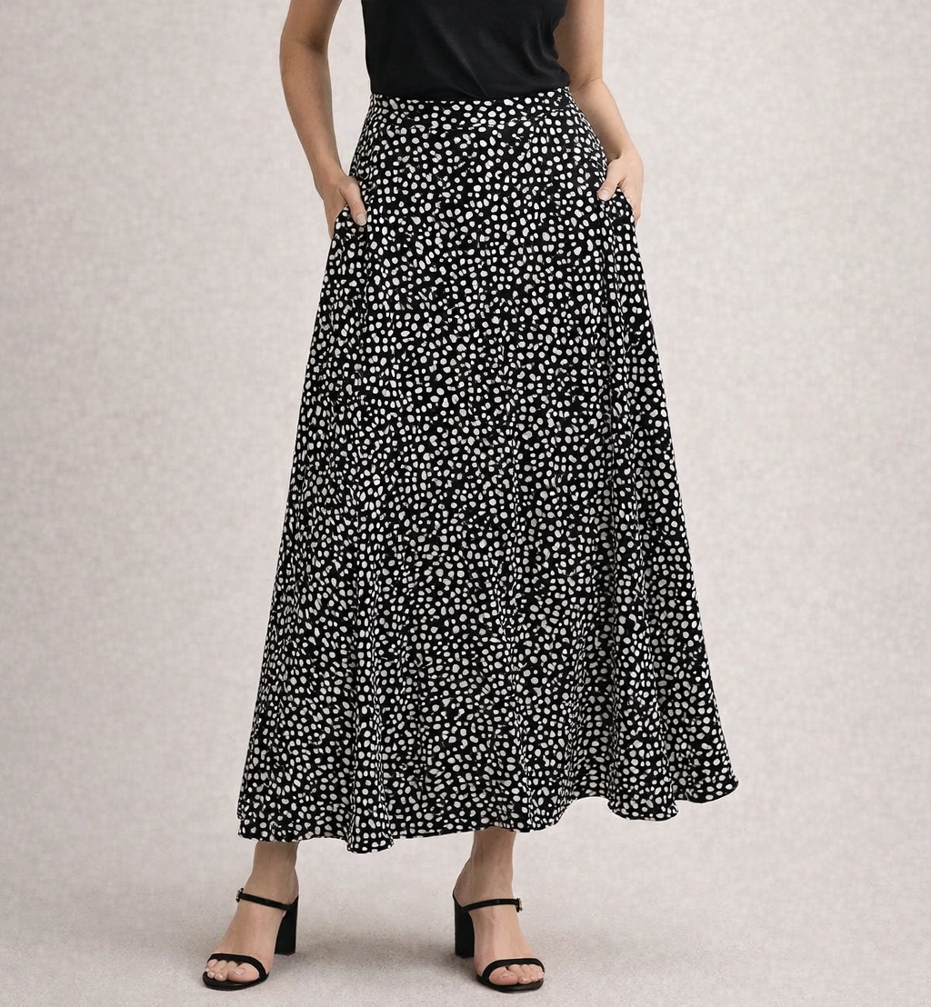 - این مدل با برش کلوش، حالت موجدار و زیبایی در حرکت ایجاد میکند و جلوهای بسیار زنانه و شیک به استایل شما میبخشد.