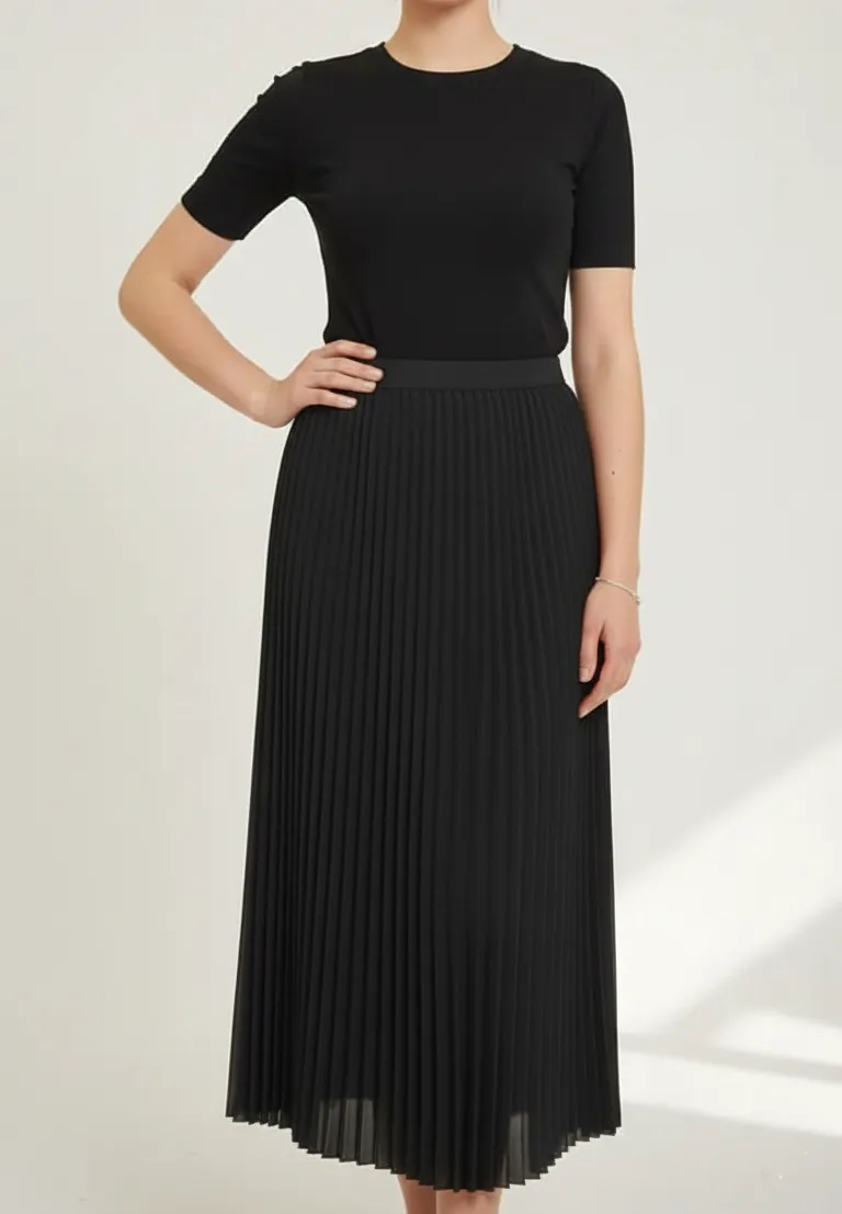 - طراحی پلیسه این دامن باعث میشود فرم بسیار زیبا و افتی ظریف روی بدن ایجاد شود و در عین سادگی، جلوهای بسیار شیک و جذاب داشته باشد.