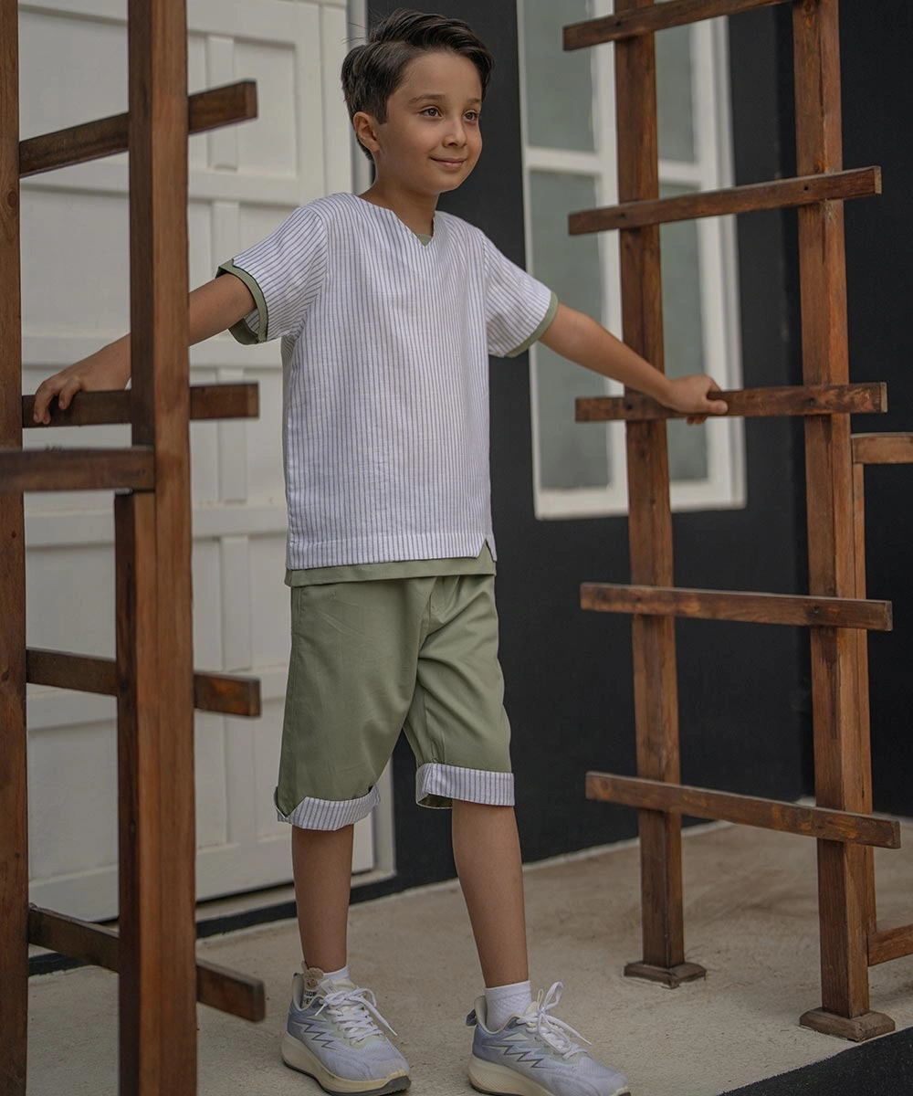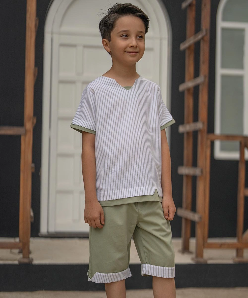 • این ست با طراحی راه‌راه جذاب در تیشرت و ترکیب با شلوارک ساده و کاربردی، ظاهری مدرن و متفاوت ایجاد می‌کند.