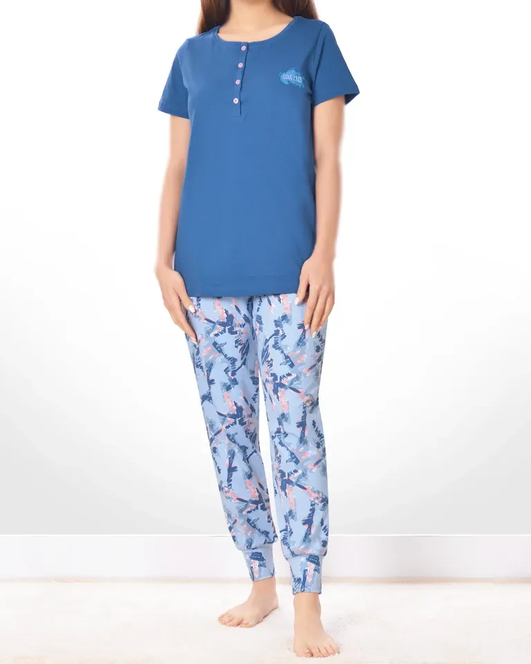 - این ست زنانه شامل تیشرت آستین کوتاه با یقه گرد و شلوار بلند ساده میباشد. روی تیشرت، طرح چاپی بسیار زیبایی با الهام از "خط عشق" طراحی شده