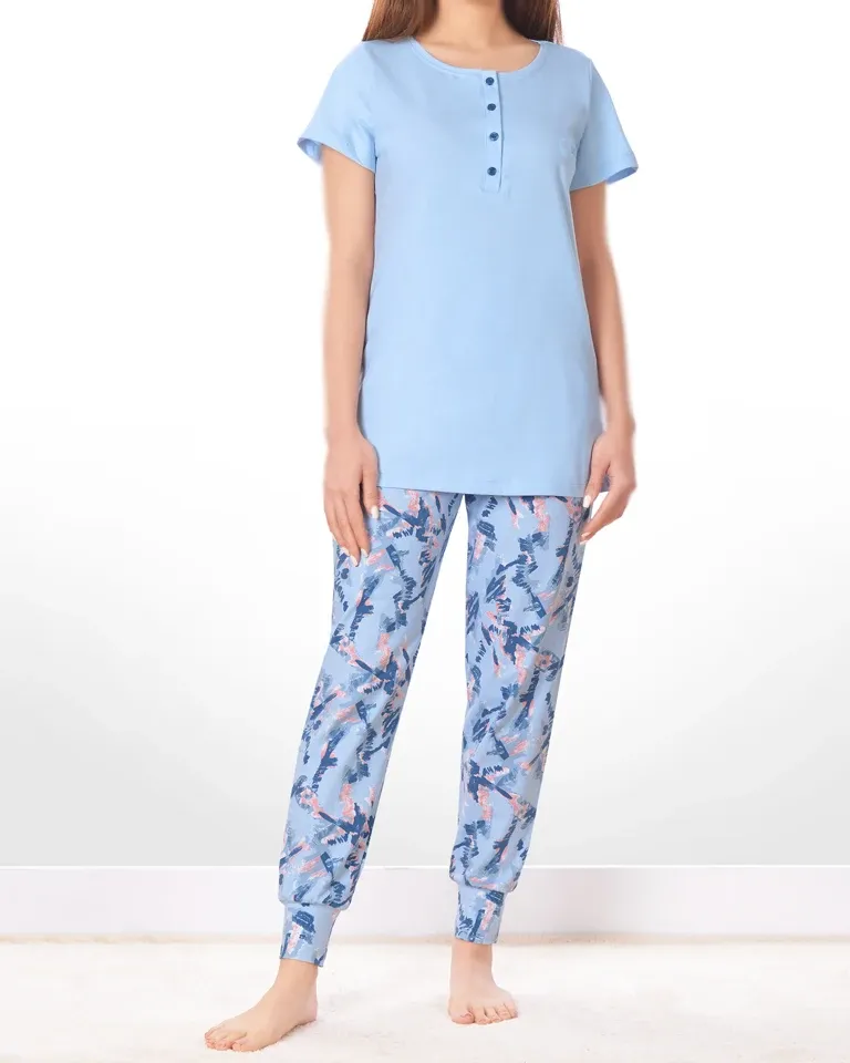 - ست تیشرت و شلوار زنانه ناربن Narbon کد 3835 از پارچه ۱۰۰٪ نخ پنبه طبیعی تولید شده است. الیاف پنبهای به دلیل خاصیت تنفسپذیری، سبکی و نرمی بسیار بالا، انتخابی عالی برای