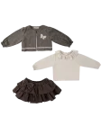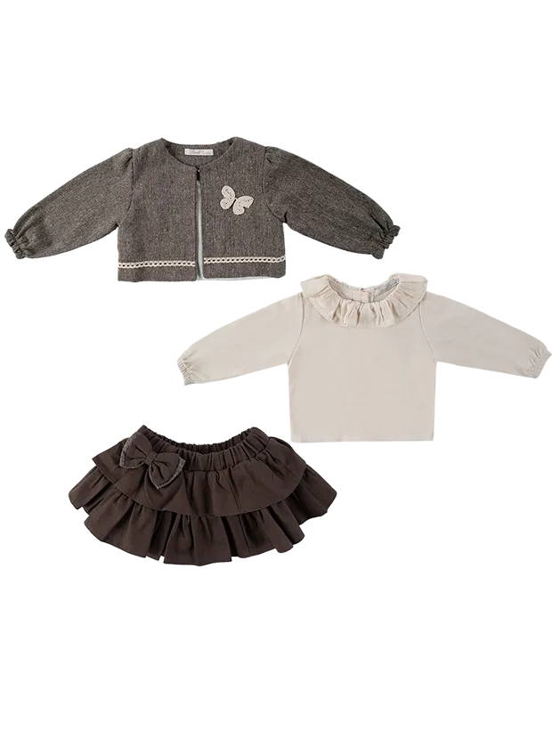 • این ست شامل کت، بلوز و دامن بوده و با طراحی خاص مدل پروانه قهوه‌ای، استایلی متفاوت و چشم‌نواز به فرزند شما می‌بخشد.