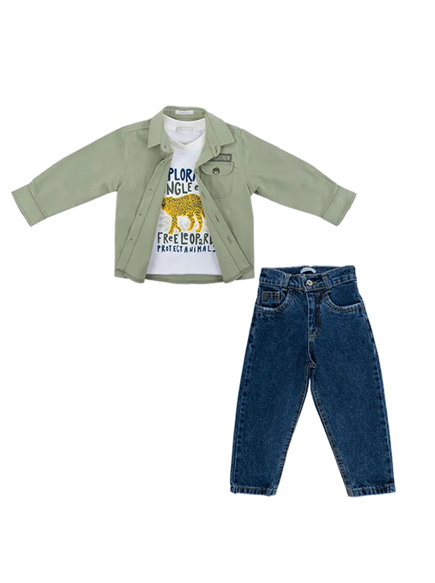 - ست سهتکه پسرانه جاستیفای Justify کد 35542 مدل جین جنگلبان با طراحی مدرن و استایلی خاص، گزینهای ایدهآل برای پسران خوشپوش است.