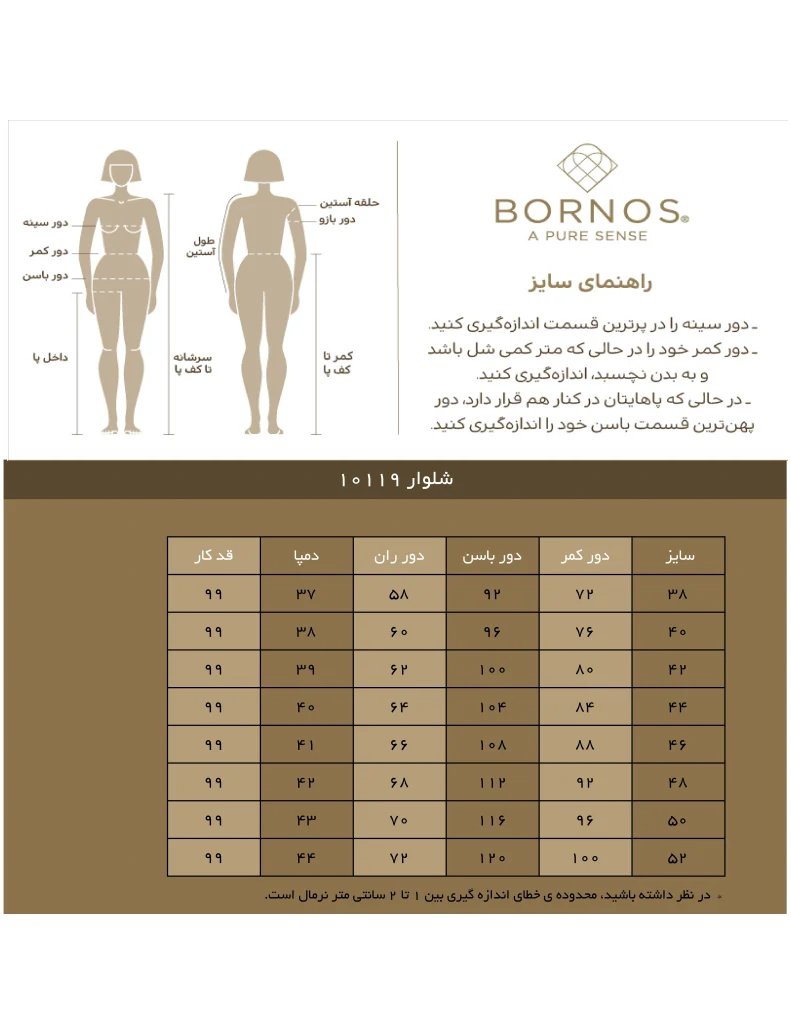 - شلوار زنانه برنس Bornos کد 10119 از جنس پارچه بزیاق تهیه شده که بافتی بسیار لطیف و نرم دارد و انتخابی ایدهآل برای فصل پاییز و زمستان محسوب میشود.
