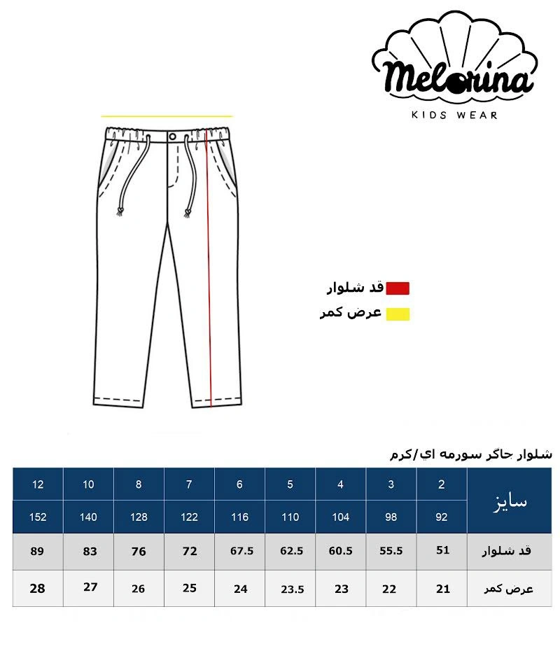 - شلوار پسرانه ملورینا Melorina کد 8216 با قد حدود 49 سانتیمتر در سایز 2 سال، فاق متوسط (19 سانتیمتر) و طرح ساده، انتخابی عالی برای استایل روزمره، مهمانی یا مهدکودک است.