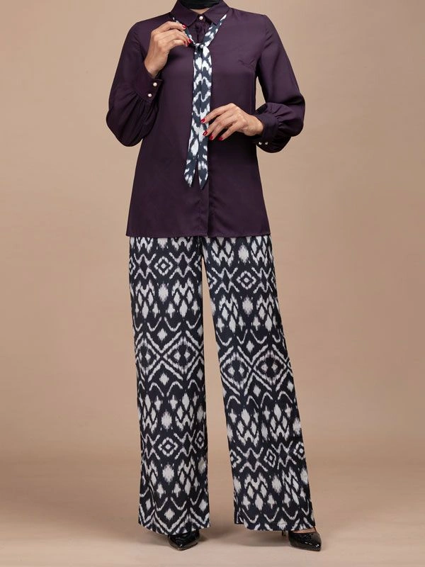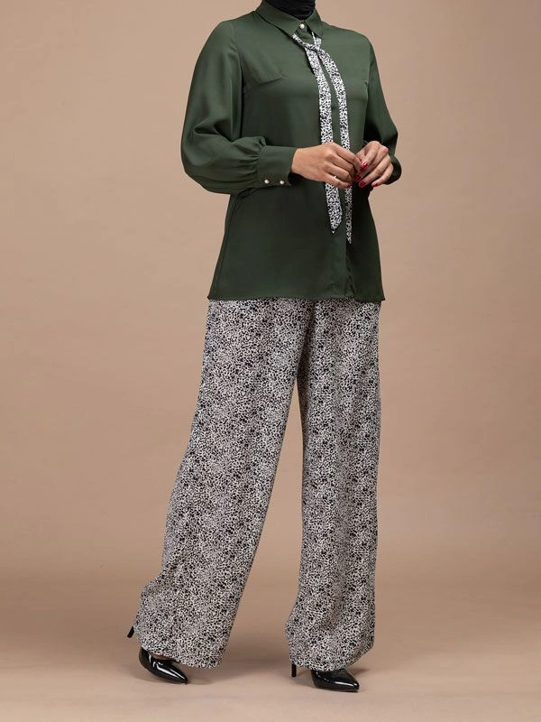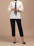 - این مدل با یقه مردانه همراه با کراوات طرحدار و پارچه کرپ حریر لطیف، ظاهری زیبا و کاربردی ارائه میدهد.
