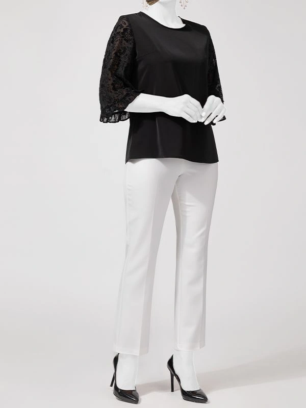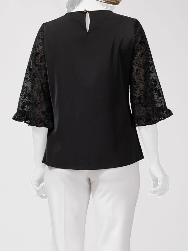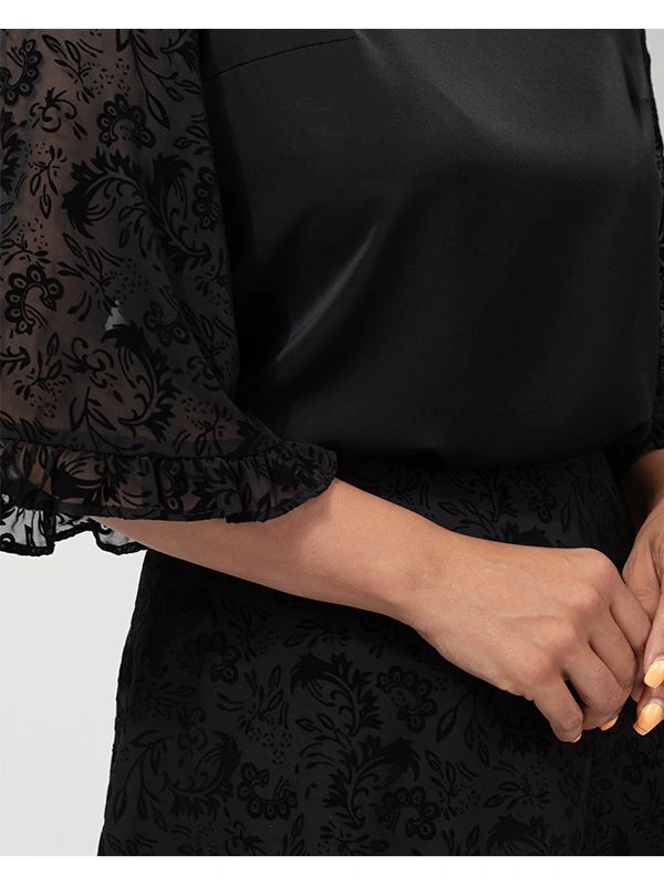 - این بلوز از ترکیب پارچههای الیزه و حریر با طرح مخمل دوخته شده و جلوهای خاص و زنانه دارد.