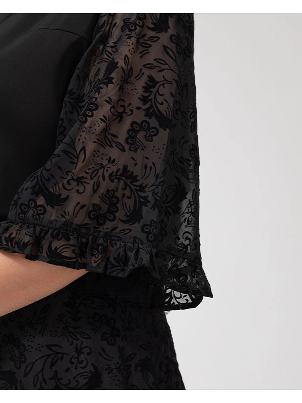 - طراحی یقه گرد و آستین سهربع از جنس حریر مخملدار با پایین آستین کلوش و چیندار، به لباس ظاهری لطیف و مجلسی بخشیده است.
