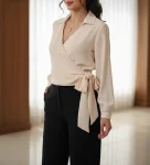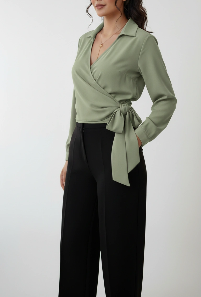 - شومیز چپ و راست گرهای به راحتی با شلوار پارچهای، جین اسکینی یا دامن جذب ست میشود و استایلی چشمنواز میسازد.