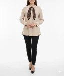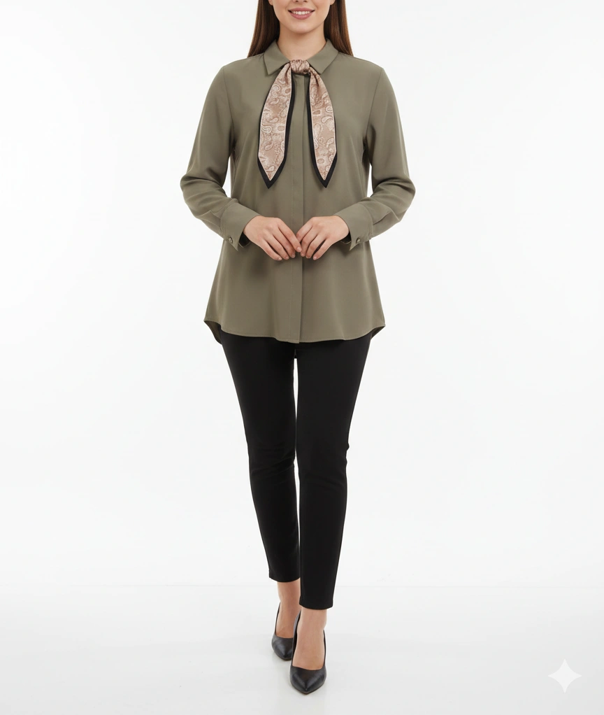 - شومیز دکمه مخفی یقه باندانا به راحتی با شلوار پارچهای، جین یا دامن ست میشود و گزینهای عالی برای محیط کار، مهمانی و استایل روزمره شیک محسوب میشود.