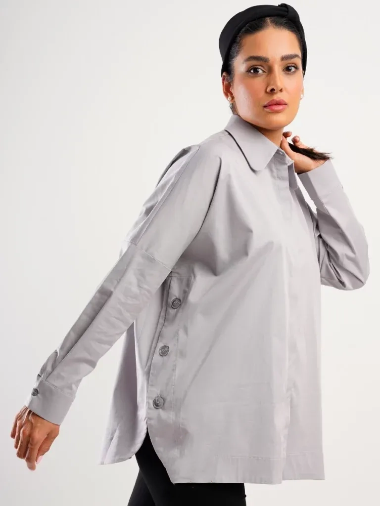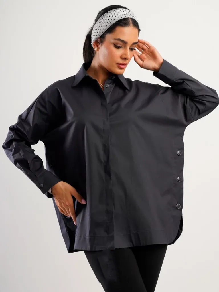 - طراحی دکمهدار در بغل لباس جلوهای خاص و متفاوت ایجاد کرده و باعث میشود این مدل هم با شلوار پارچهای رسمی و هم با جین یا دامن قابل ست کردن باشد.