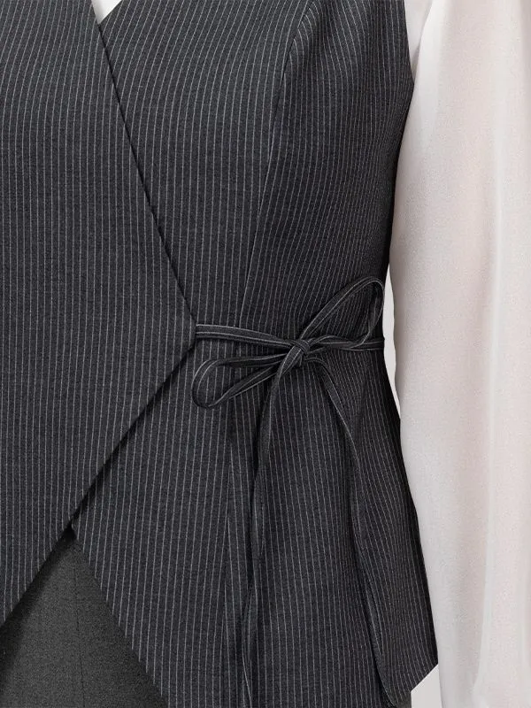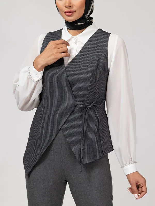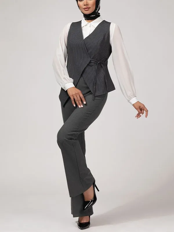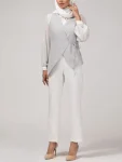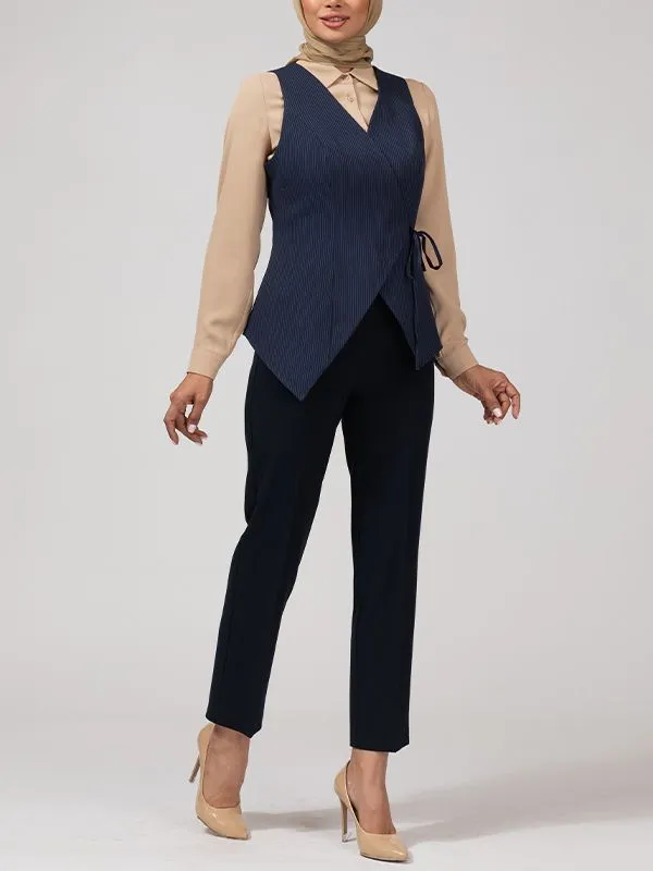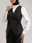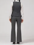- طراحی یقه هفت و مدل چپ و راستی، جلوهای حرفهای و خوشفرم به این وست زنانه بخشیده است.