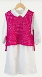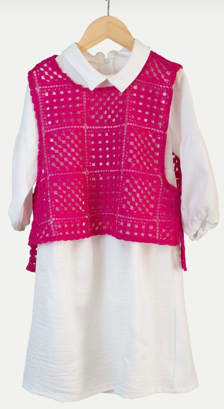 - تاپ رویی با قلاببافی ظریف و طراحی حلقهای با یقه گرد ساده، به زیبایی روی پیراهن قرار گرفته و ترکیب منحصربهفردی از سادگی و ظرافت ایجاد میکند.