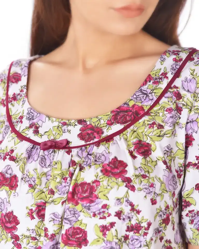 - یکی از ویژگیهای برجسته این پیراهن، استفاده از پارچه تمام نخ پنبهای است. نخ پنبهای یکی از مناسبترین الیاف برای تولید لباسهای راحتی و خانگی محسوب میشود، چرا که تنفسپذیری بالایی دارد و باعث میشود حرارت بدن به راحتی خارج شود. همین موضوع، باعث ایجاد حس خنکی، راحتی و جلوگیری از تعریق بیش از حد در طول روز میشود. همچنین این پارچه به دلیل لطافت طبیعی خود، در تماس با پوست احساس نرمی و آسایش خاصی ایجاد میکند و برای پوستهای حساس نیز بسیار مناسب است.