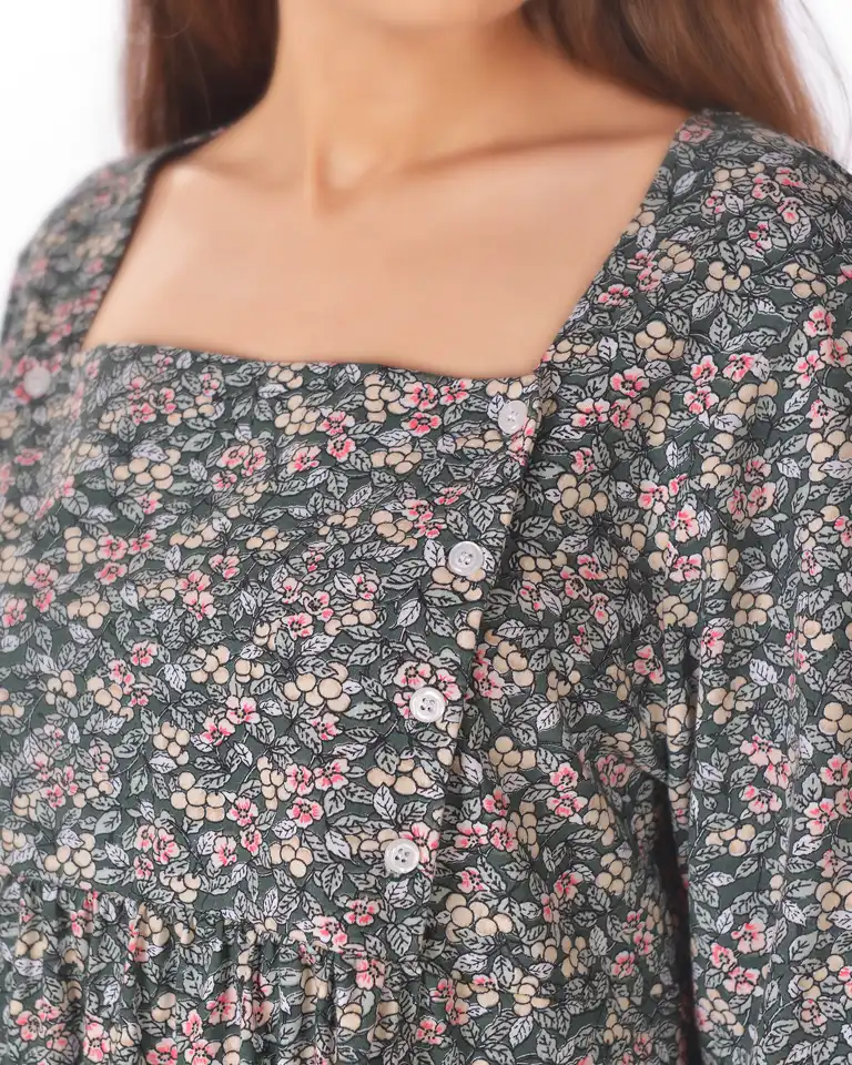 - پارچه این لباس از ۱۰۰٪ نخ پنبه طبیعی تهیه شده و با طرح گلهای ریز و زیبا، جلوهای لطیف و زنانه به آن بخشیده است.