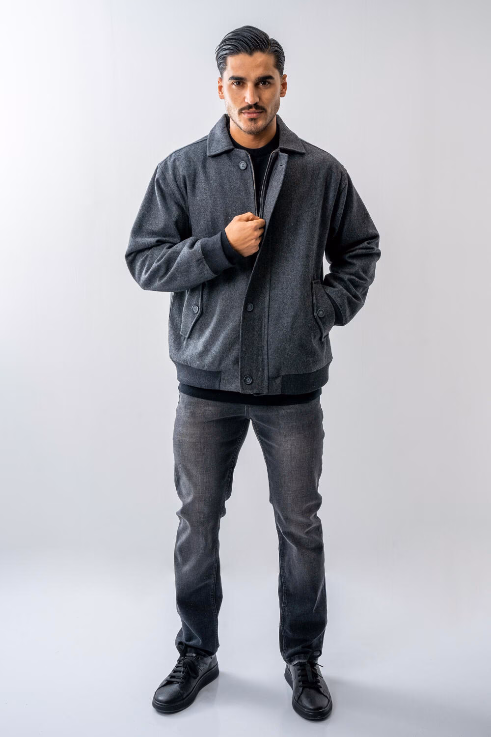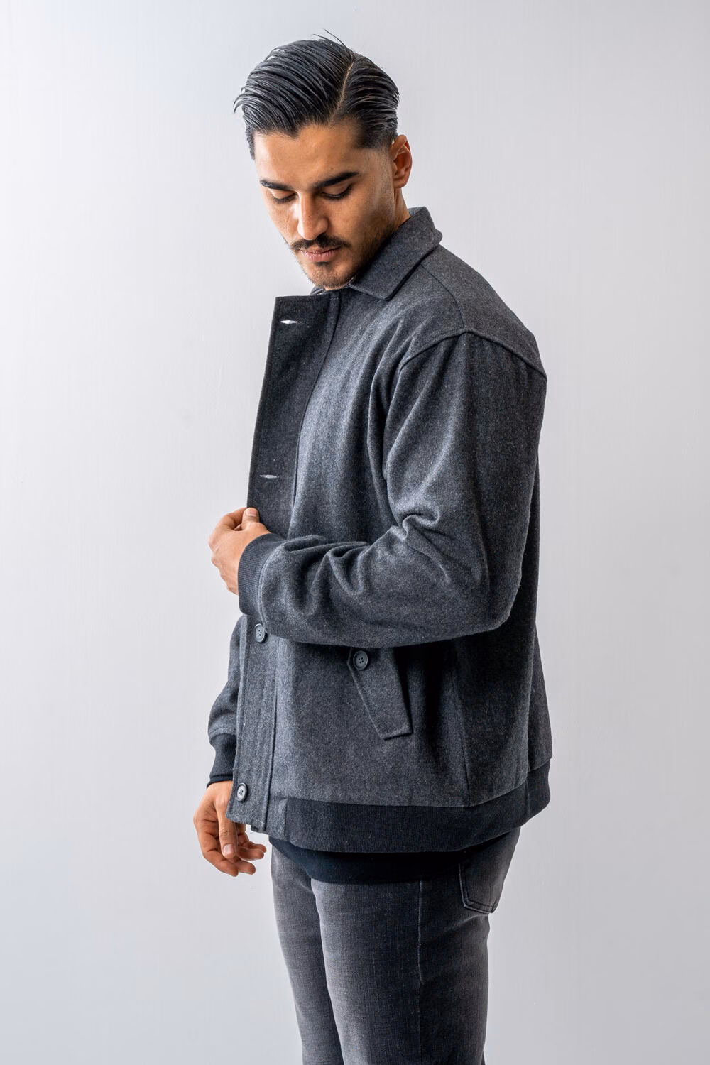 - در تصاویر، مدل با قد ۱۸۵ سانتیمتر سایز XXL را پوشیده است که نشاندهندهی افت طبیعی و آزاد کت در این سایز میباشد.