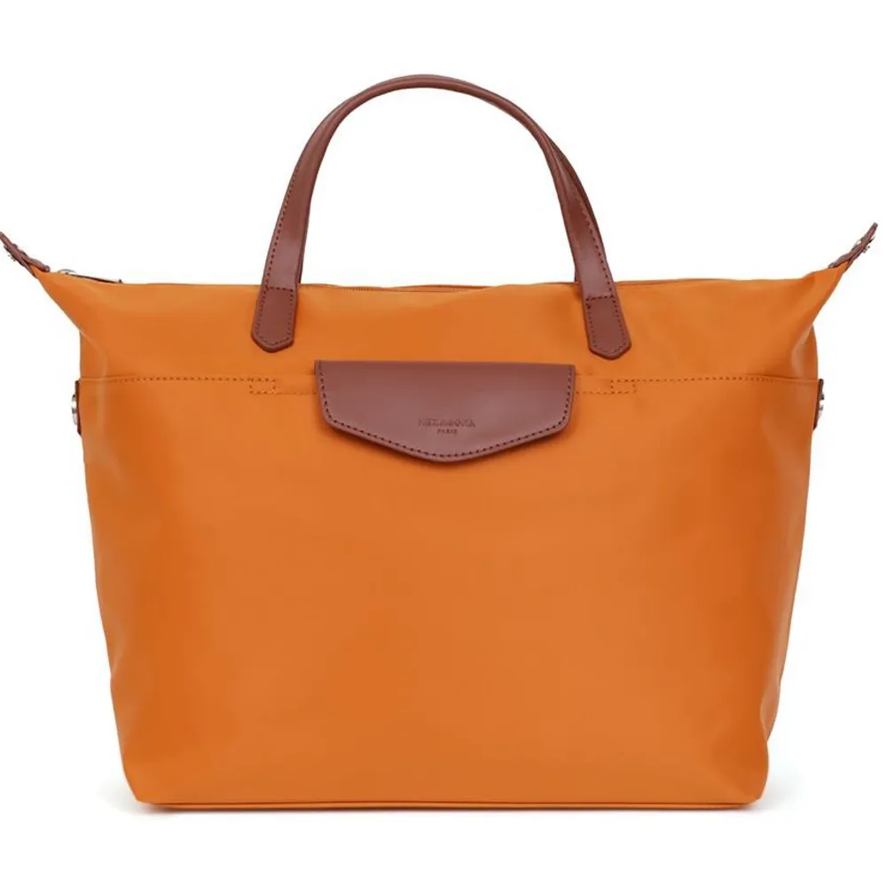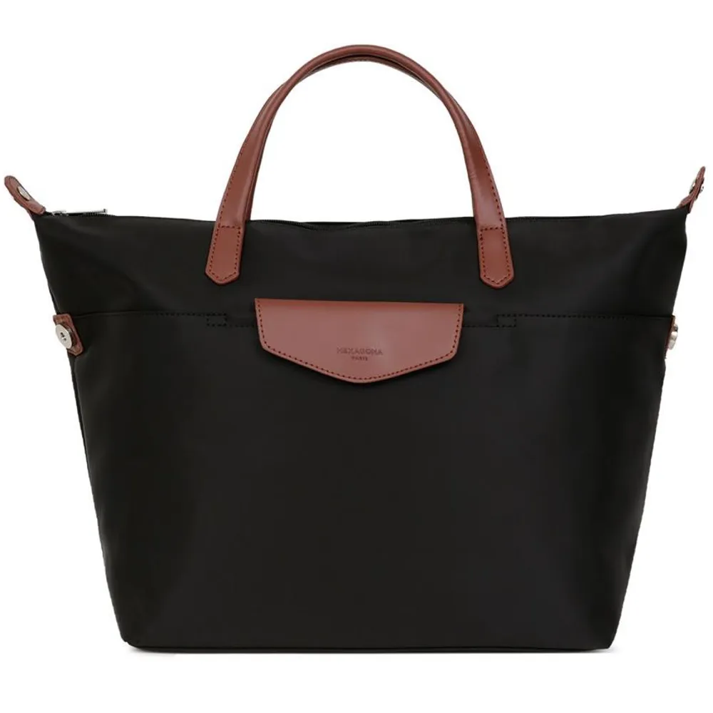 • جنس بدنه: پارچه نایلون با تکه‌دوزی چرم مصنوعی روی دسته‌ها و بخش جلویی کیف