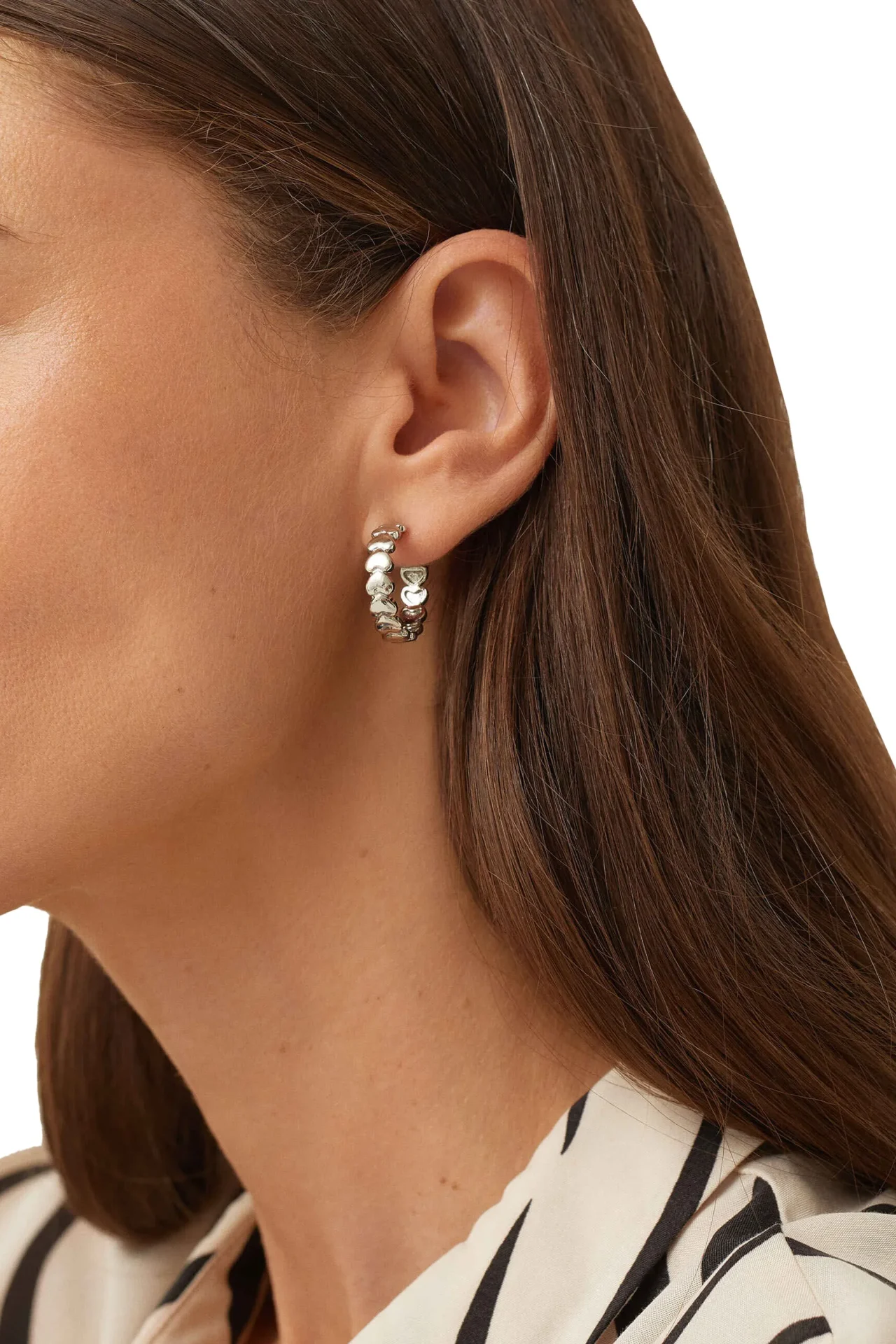 این مدل در دسته Hoop Earrings (حلقهای) قرار دارد و به دلیل سایز کوچک و طراحی مینیمال، جلوهای ظریف و کلاسیک به استایل شما میدهد. رنگ نقرهای (Silver) باعث شده که این گوشواره زنانه پارفوآ با هر رنگ لباس و هر نوع استایلی بهراحتی ست شود.