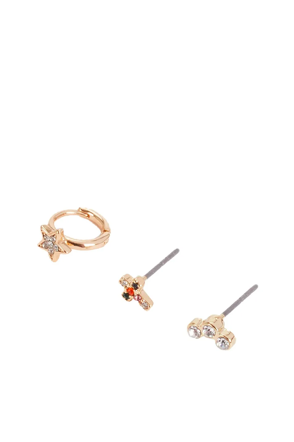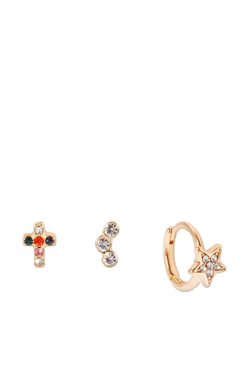 این گوشوارهها در دسته Stud Earrings (میخی/کوتاه) قرار میگیرند و با آویزهای کوچک و شیک، جلوهای دخترانه و ظریف ایجاد میکنند. رنگ طلایی (Gold) در ترکیب با نگینهای درخشان، جلوهای لوکس و چشمگیر ساخته است. طراحی چندتایی این ست باعث میشود بتوانید آن را به صورت تکی یا ترکیبی استفاده کرده و استایلهای متفاوتی بسازید.